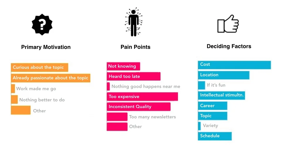 Interestingly, but not surprisingly, the factors that resonated as deciding factors for attending a class were often the same or related to users' pain points. Another cool discovery: the group's workshop interest was split nearly 50/50 between business and pleasure.