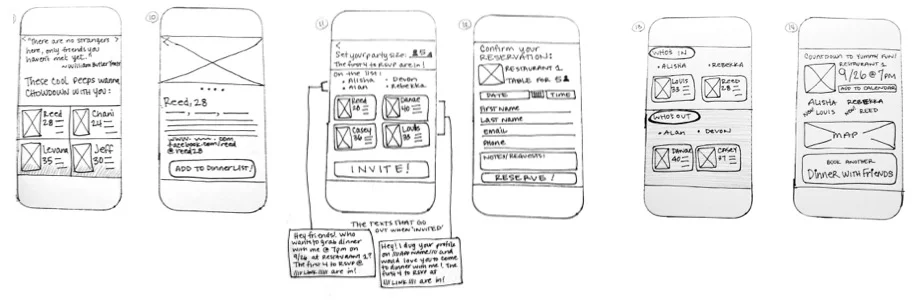 The second iteration of wireframes streamlined the selection process further, and gave users a choice up front for if they wanted to start by choosing their guests or choosing their restaurant. This version shows short user profile views as well.