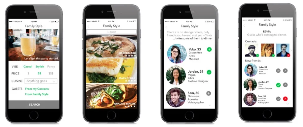 In addition, Family Style allows users to make new friends via communal dining: Users can view the brief profiles of other users of the app, and invite them to dinner. Invitees can accept or decline an invitation in one tap.